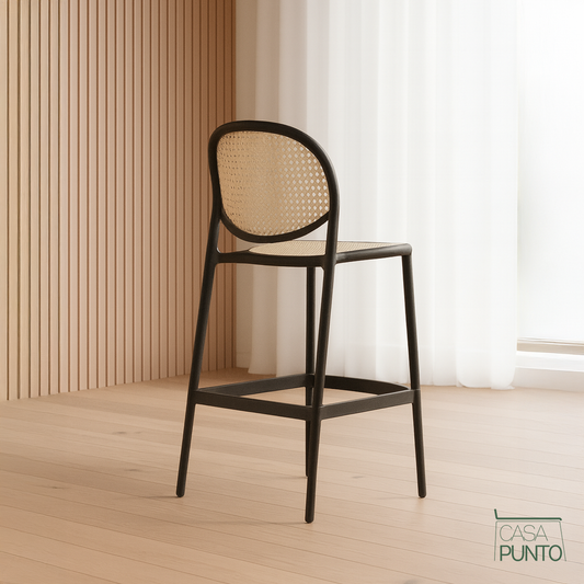 • Taburete de bar Hedda con respaldo de ratán sintético - Trona estilo bistró