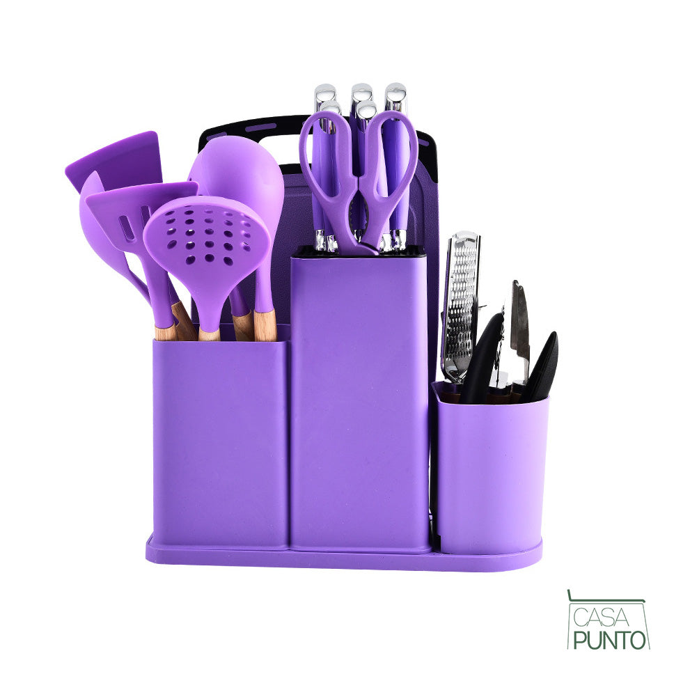 Infuse your kitchen with vibrant personality and professional performance. The Lyra 20-piece kitchen knife and cookware set from the CASA PUNTO collection is the ultimate all-in-one solution that transforms your kitchen into a colorful culinary haven. This isn't just a kitchen set—it's a complete cooking ecosystem in stunning purple that includes cookware, knives, utensils, and organizers.