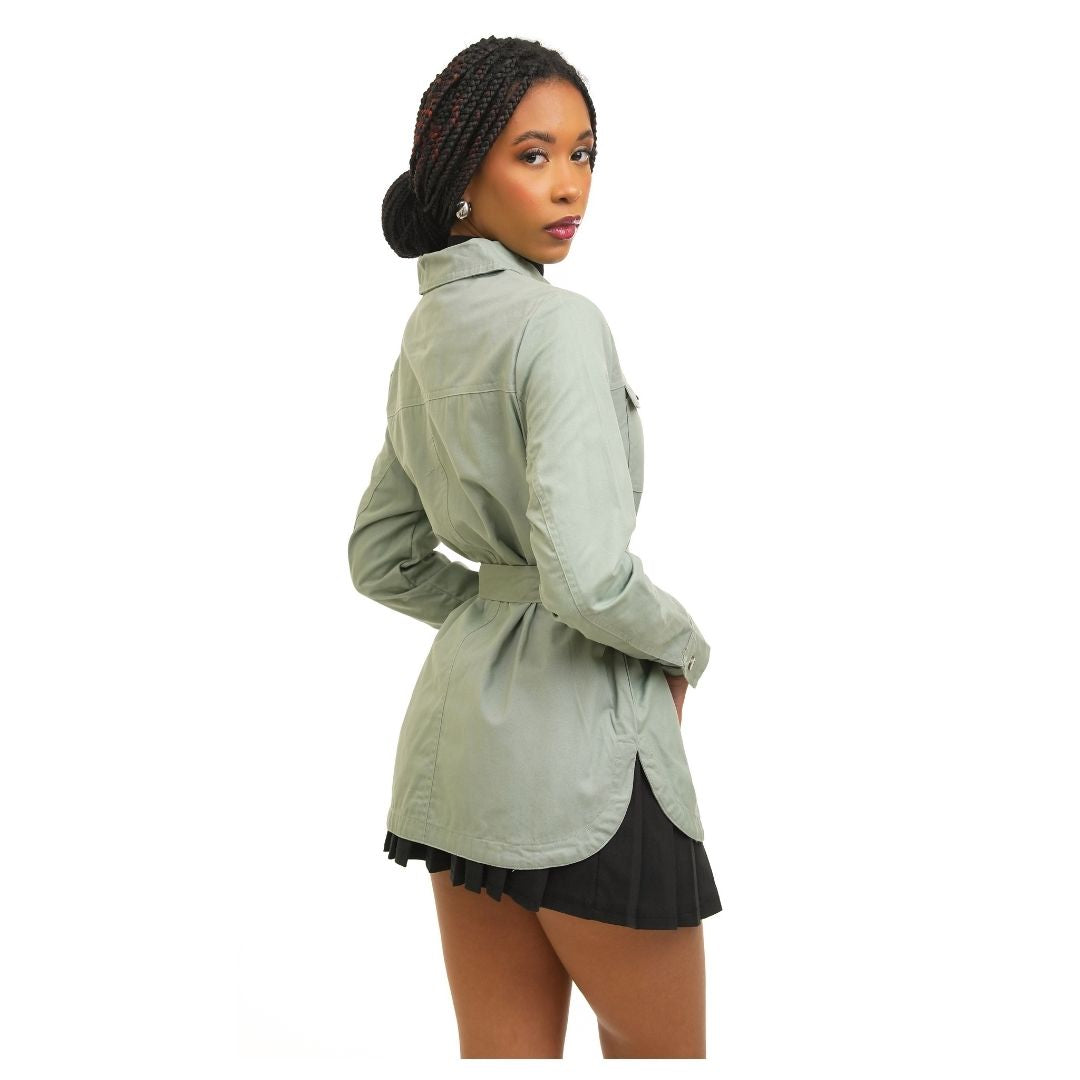 Diseño elevado con una tela suave y discretos botones metálicos. Incluye cinturón para ceñir la cintura, creando una silueta femenina y elegante. Dos bolsillos de parche con solapa y cierre de botones en el pecho añaden un toque práctico. Los puños abotonados te permiten ajustar el ancho de las mangas o llevarlas enrolladas. Perfecto para usar sobre camisetas o blusas cortas durante el clima de transición.