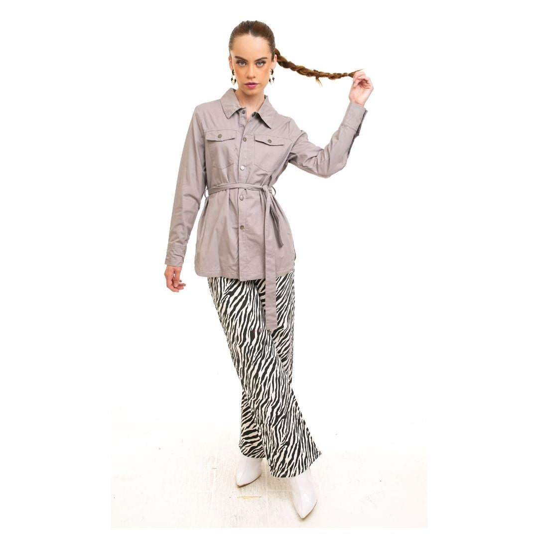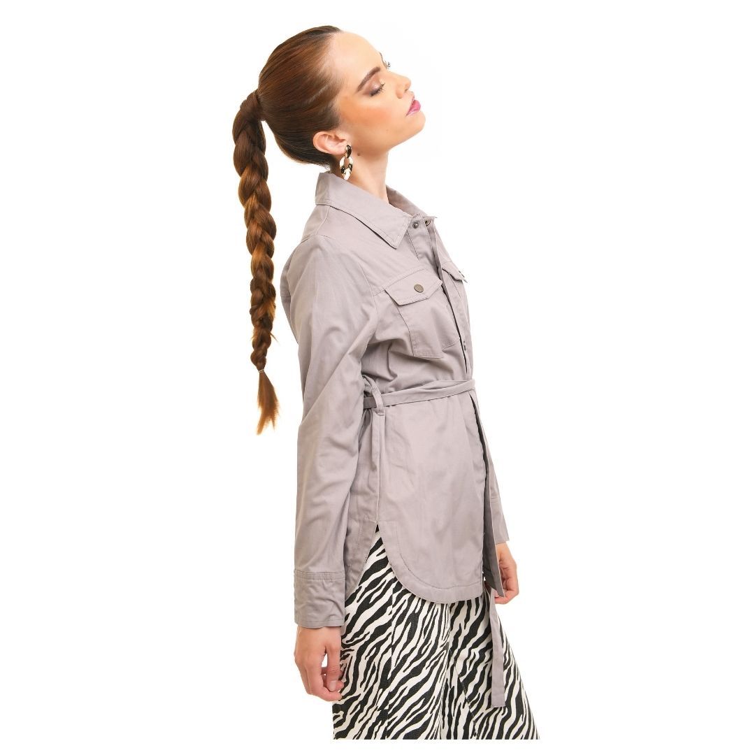 Diseño elevado con una tela suave y discretos botones metálicos. Incluye cinturón para ceñir la cintura, creando una silueta femenina y elegante. Dos bolsillos de parche con solapa y cierre de botones en el pecho añaden un toque práctico. Los puños abotonados te permiten ajustar el ancho de las mangas o llevarlas enrolladas. Perfecto para usar sobre camisetas o blusas cortas durante el clima de transición.