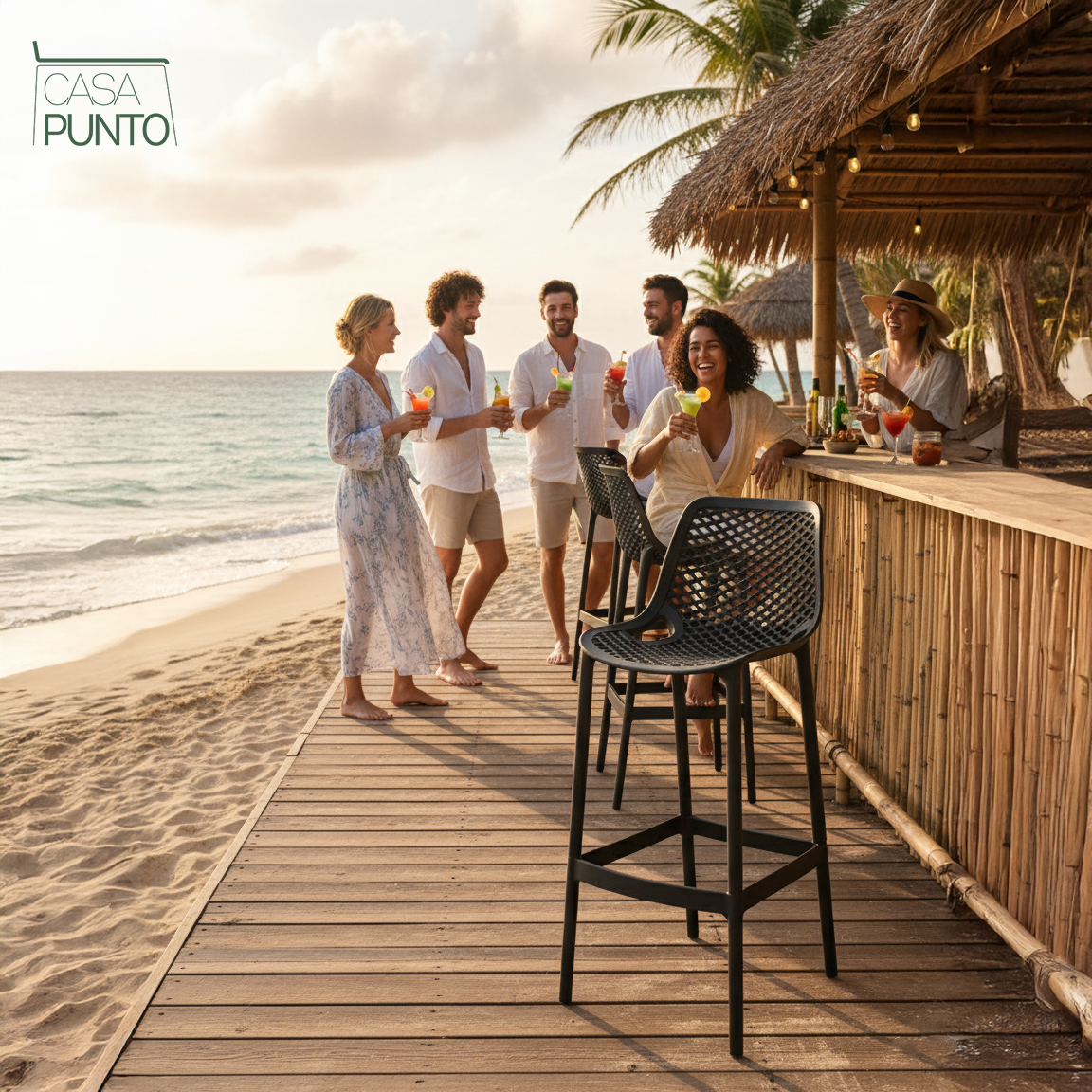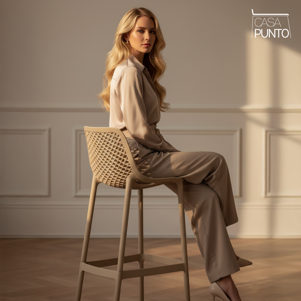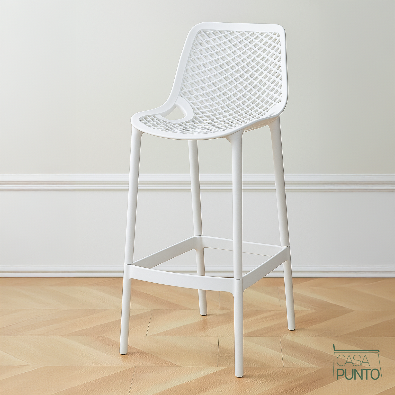 Una pieza estrella de la colección CASA PUNTO, el taburete alto Dorte combina un diseño contemporáneo con una funcionalidad superior. Su característica principal es el respaldo y el asiento ergonómicos, ambos con un sofisticado patrón de rejilla perforada que no solo aligera su apariencia visual sino que también garantiza una ventilación óptima, perfecta para cualquier época del año.