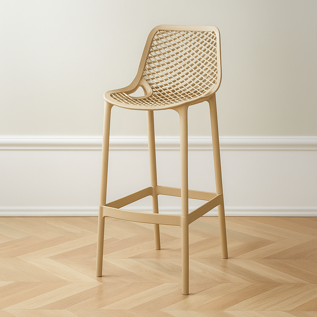 Fabricado a partir de una sola pieza de polipropileno espesado de alta durabilidad, este taburete color camel está diseñado para soportar un uso intensivo sin perder su encanto. Su estructura de cuatro patas se complementa con un reposapiés cuadrado a juego, lo que garantiza estabilidad y comodidad.
