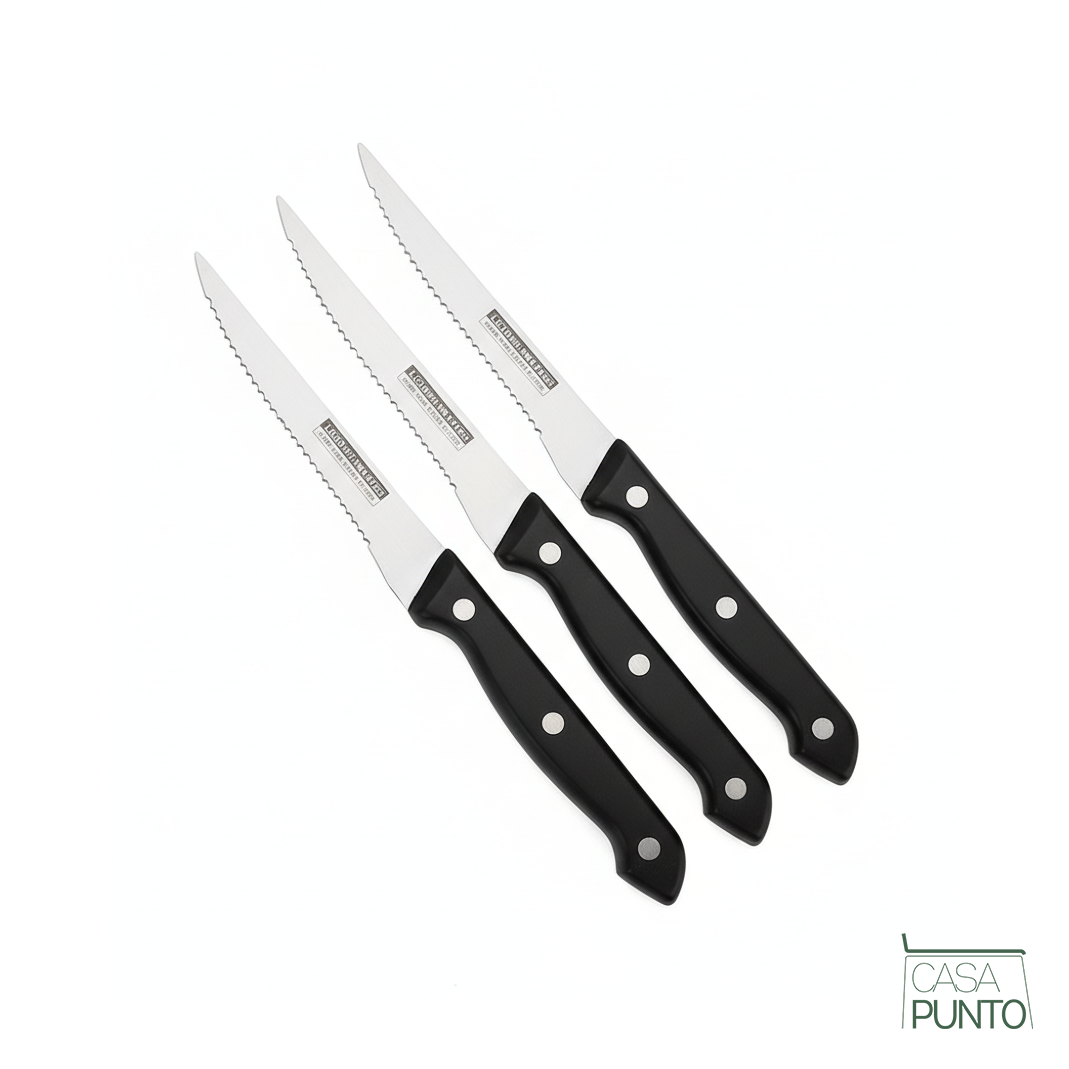 Con hojas dentadas de acero inoxidable con alto contenido de carbono y mangos clásicos negros de triple remache, este juego ofrece un rendimiento de corte excepcional para todas sus necesidades gastronómicas. El borde dentado se desliza a través de filetes, asados, barbacoas y carnes a la parrilla sin romperse ni desmenuzarse, mientras que los mangos ergonómicos con triple remache brindan un agarre cómodo y seguro. El acabado negro atemporal complementa cualquier mesa, desde cenas familiares informales hasta eventos elegantes. Perfecto para amantes de la carne, entusiastas de la barbacoa, cenas, registros de bodas o cualquier persona que aprecie los cubiertos de calidad profesional en la mesa del comedor.