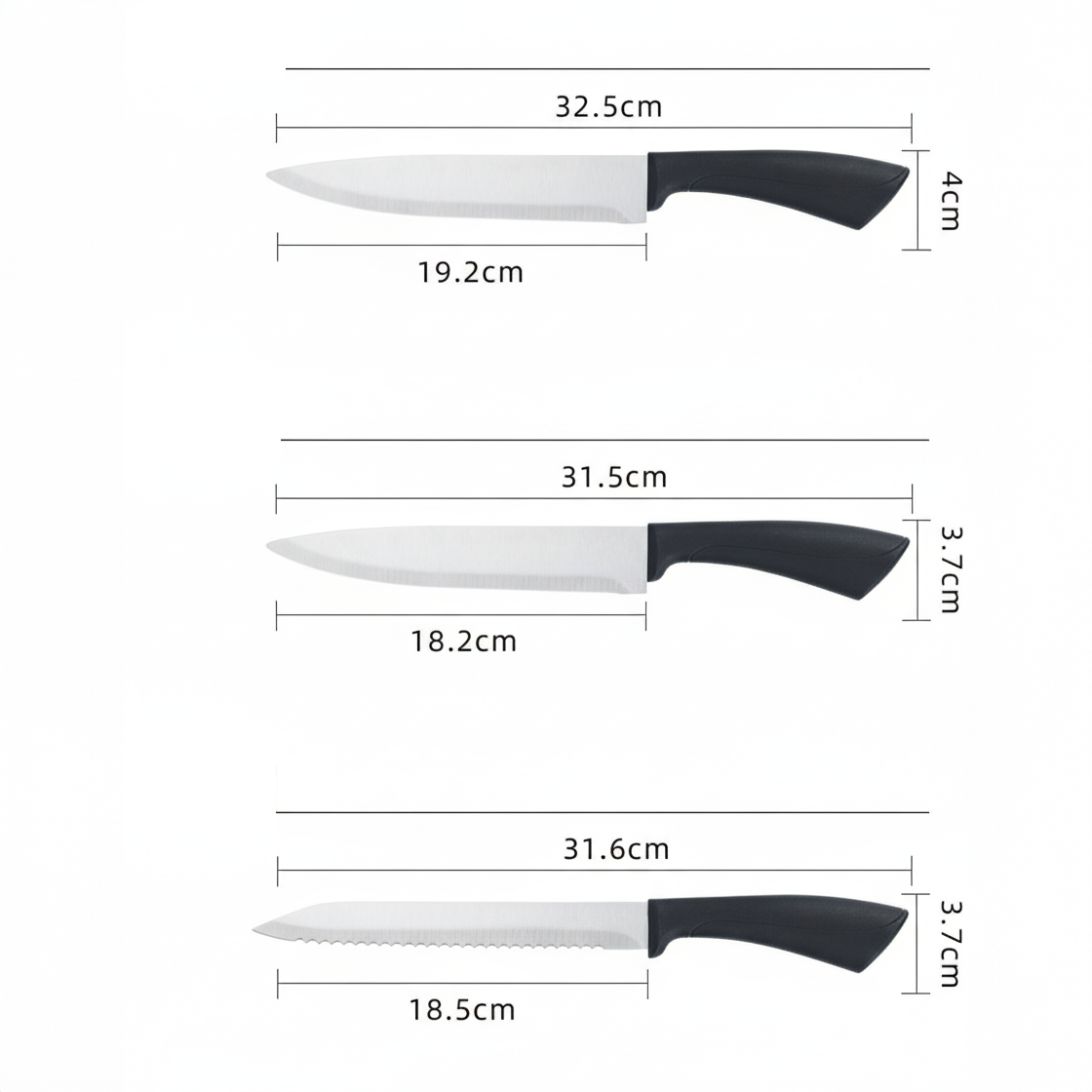 Con hojas de acero inoxidable con alto contenido de carbono con mangos ergonómicos, un bloque de almacenamiento de madera sólida, tijeras de cocina y una herramienta para afilar, este juego incluye todos los cuchillos esenciales para una versatilidad total en la cocina. El cuchillo de chef, el cuchillo para pan, el cuchillo para trinchar, el cuchillo multiusos, los cuchillos para pelar y los cuchillos para carne satisfacen todas sus necesidades de corte con precisión profesional. El bloque de madera mantiene sus cuchillos organizados, protegidos y al alcance de la mano, mientras que el acero para afilar incluido mantiene los bordes afilados. Perfecto para chefs caseros, registros de bodas, mejoras de cocina o cualquier persona que exija rendimiento profesional y estilo atemporal en sus cubiertos.
