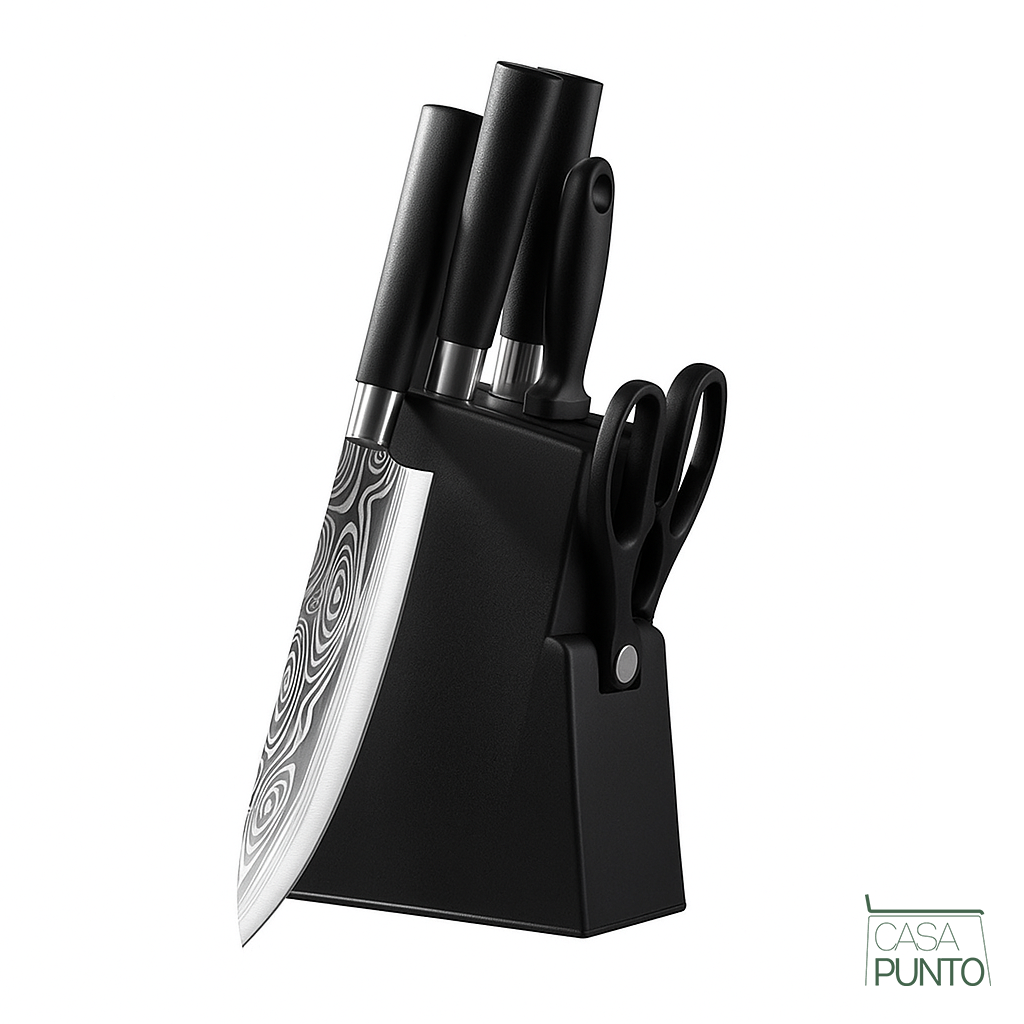 - El juego esencial de 6 piezas incluye los cuchillos más usados, además de tijeras y un bloque de madera
