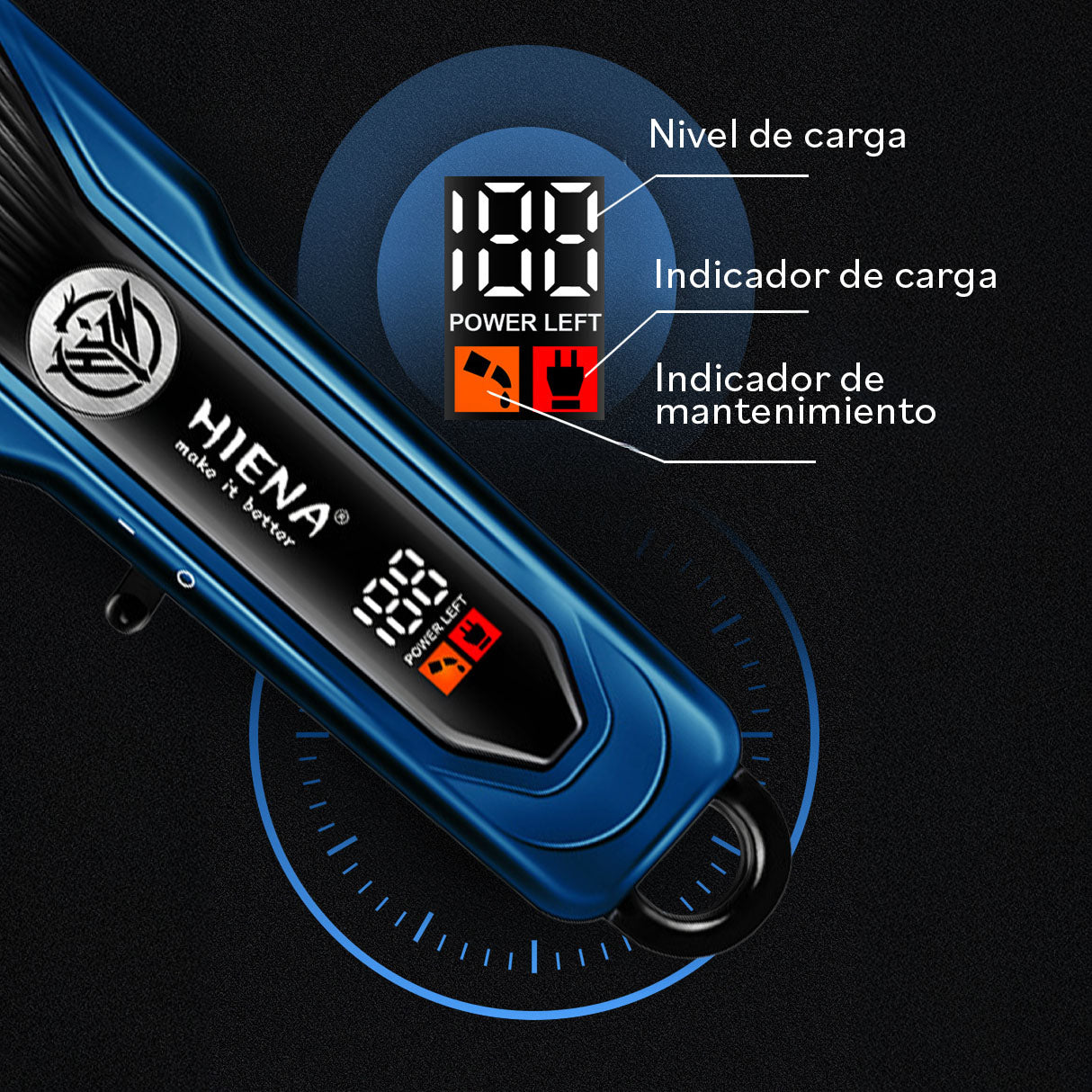 Achieve barbershop-quality results with the Hiena Azul Professional Hair Clipper. This high-performance tool features a built-in LCD digital display that provides real-time battery level and maintenance information. Designed with precision stainless steel blades, it delivers a smooth, effortless cut, from detailed hairstyles to full head shaves. Its ergonomic metallic blue body combines style with a secure grip for total control.