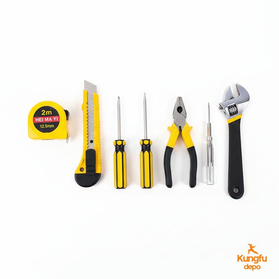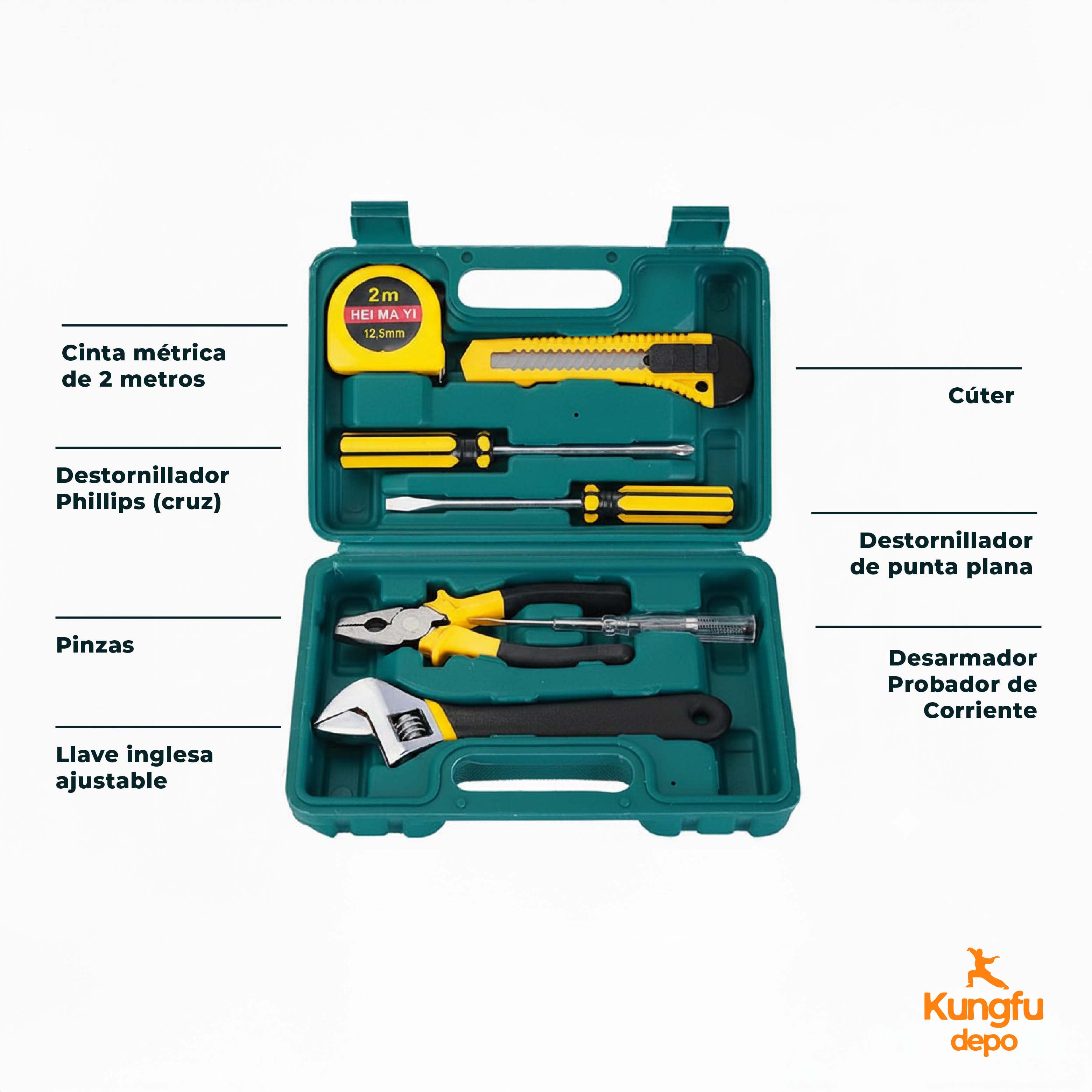 Transforme las reparaciones de su hogar con una potencia profesional compacta. El juego de herramientas de ayuda para el hogar Essential de 8 piezas de la colección Kungfu Depo es el mejor juego de herramientas para el hogar que brinda comodidad organizada y versatilidad diaria a su hogar, apartamento o automóvil. Este no es solo un juego de herramientas: es una solución de reparación completa en un resistente estuche verde azulado con ocho herramientas esenciales que incluyen cinta métrica, destornilladores, alicates, probador de voltaje y llave ajustable que maneja el 90 % de las tareas domésticas diarias con facilidad.