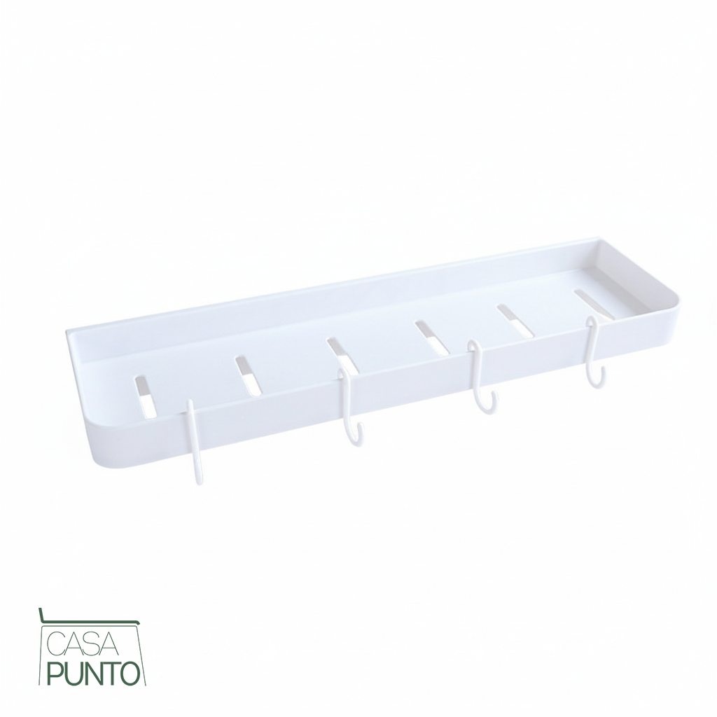 - Cuatro ganchos blancos se deslizan en las ranuras frontales para colgar tazas, paños de cocina, espátulas o utensilios