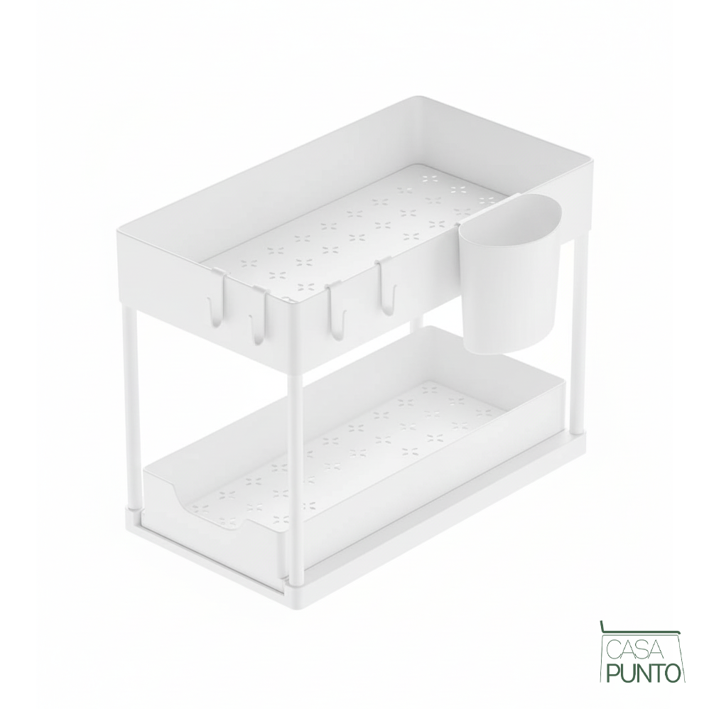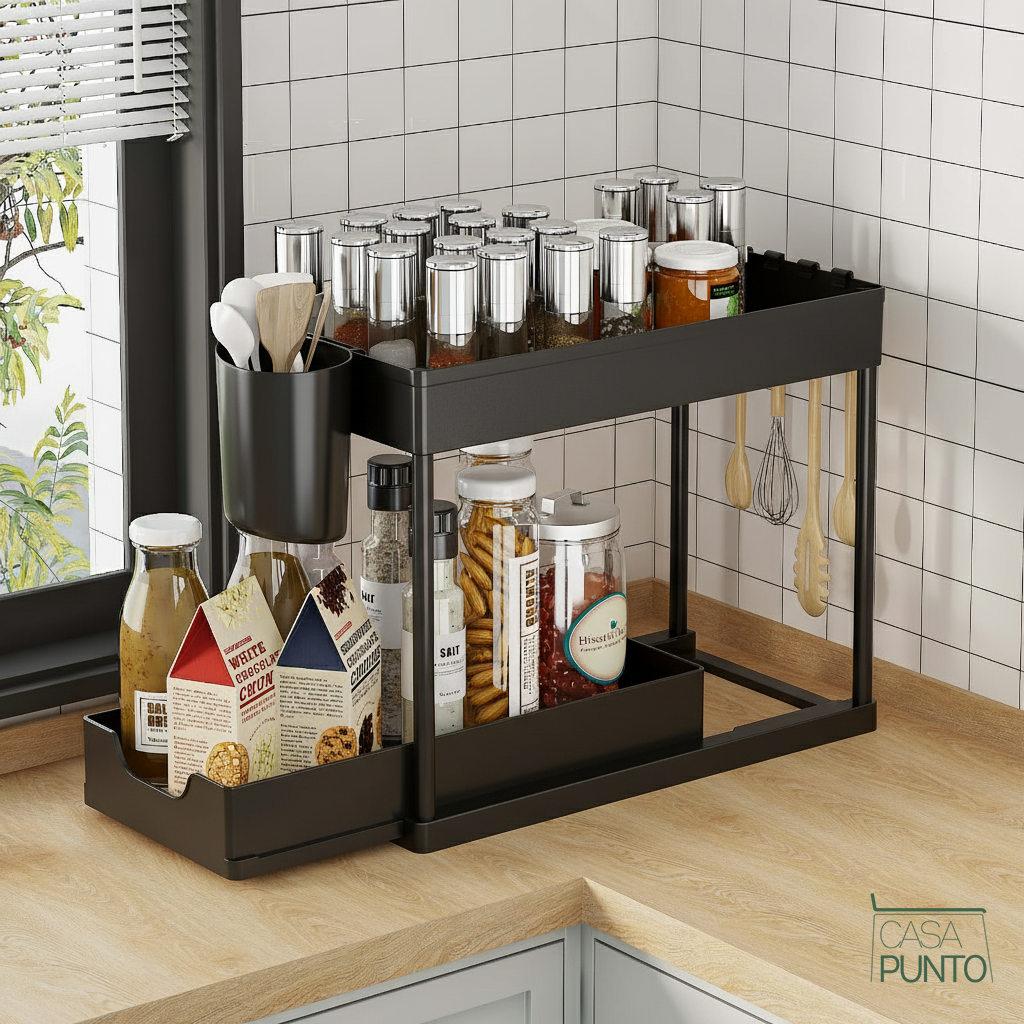 Transforma gabinetes desordenados en perfección organizada. El organizador de gabinete extraíble de 2 niveles Silvia de la colección CASA PUNTO es la solución de almacenamiento definitiva que maximiza cada centímetro de espacio del gabinete con tecnología deslizante inteligente. Esto no es solo una canasta de almacenamiento: es un sistema de organización completo con dos niveles deslizantes, ganchos integrados y un acabado elegante que aporta orden y estilo a su cocina, baño o espacio de servicio.