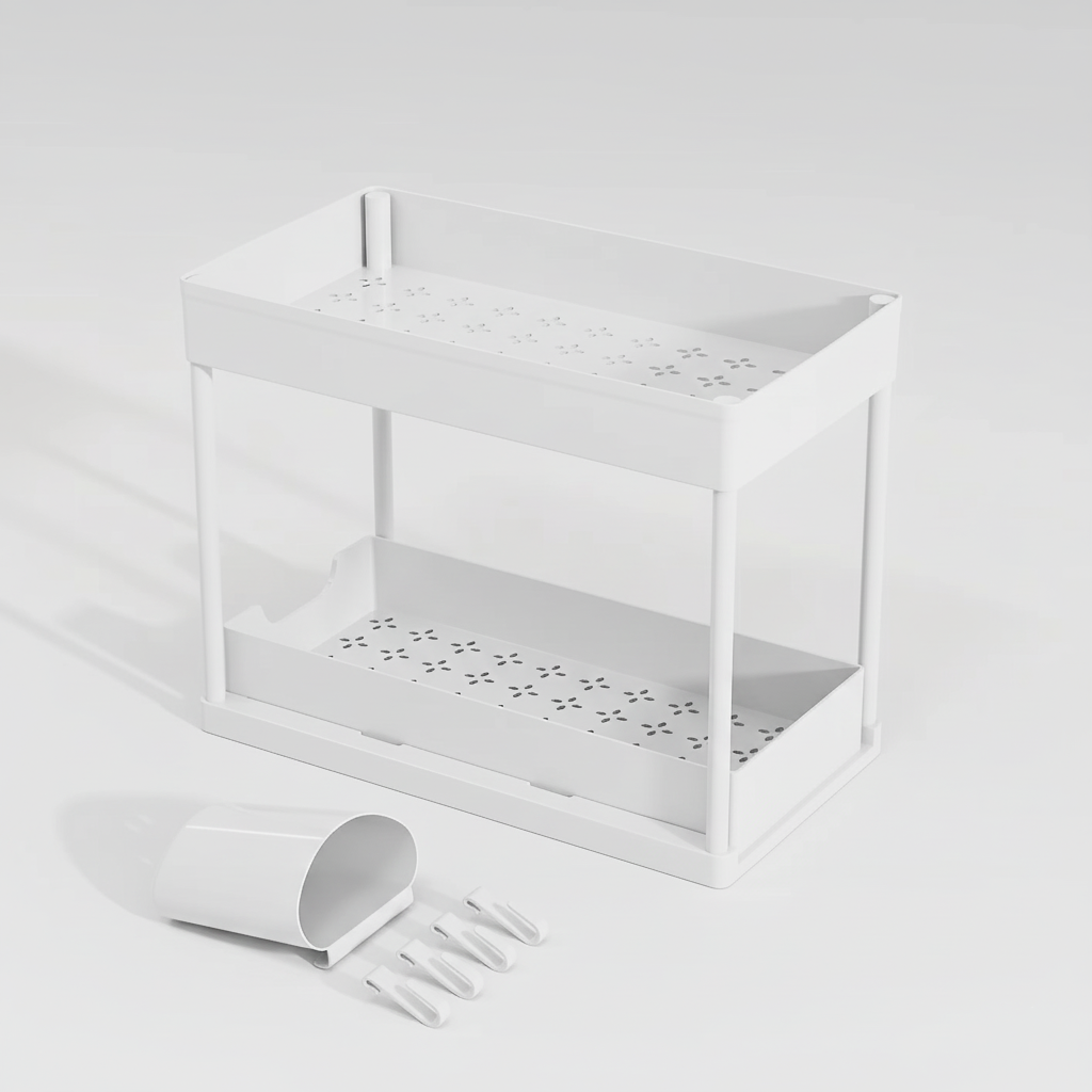 Con una construcción de plástico ABS y PP de alta resistencia en un sofisticado negro mate con un mecanismo deslizante de deslizamiento suave, este organizador encaja perfectamente debajo de fregaderos, en gabinetes estrechos y espacios reducidos. El diseño de dos niveles duplica su capacidad de almacenamiento, mientras que los ganchos integrados brindan almacenamiento adicional para colgar tazas, utensilios o herramientas de limpieza. La cesta deslizante extraíble permite un fácil acceso a los artículos en la parte trasera sin quitar todo lo que está delante. Perfecto para gabinetes de cocina, organización debajo del fregadero, almacenamiento de baño, artículos de limpieza, especieros o cualquier persona que quiera maximizar el espacio del gabinete con una organización profesional.