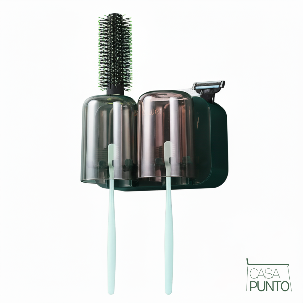 Su diseño es la definición de inteligencia: la parte superior es un estante de 16 cm de ancho, perfecto para tu maquinilla de afeitar, un peine o tus productos para el cuidado de la piel. Debajo, dos tazas magnéticas en un moderno color ahumado translúcido se colocan al revés. Este diseño de drenaje invertido es una brillantez higiénica: el agua se drena completamente, evitando la acumulación de suciedad y manteniendo los cepillos (manuales o eléctricos) impecablemente secos y protegidos.