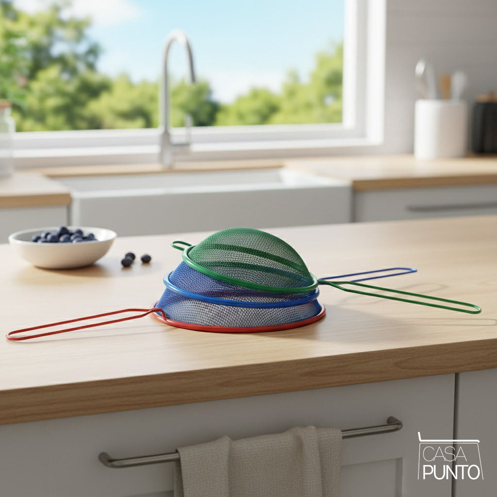 Cuela, tamiza y filtra con precisión y estilo. El juego de mini colador Corfú de 3 piezas de la colección CASA PUNTO es el elemento esencial de cocina versátil que sirve para todo, desde hojas de té hasta harina, pasando por quinua y cócteles. Este no es solo un juego de coladores, es un sistema de filtrado completo en colores vibrantes que hace que cocinar, hornear y preparar bebidas sea más fácil y agradable.